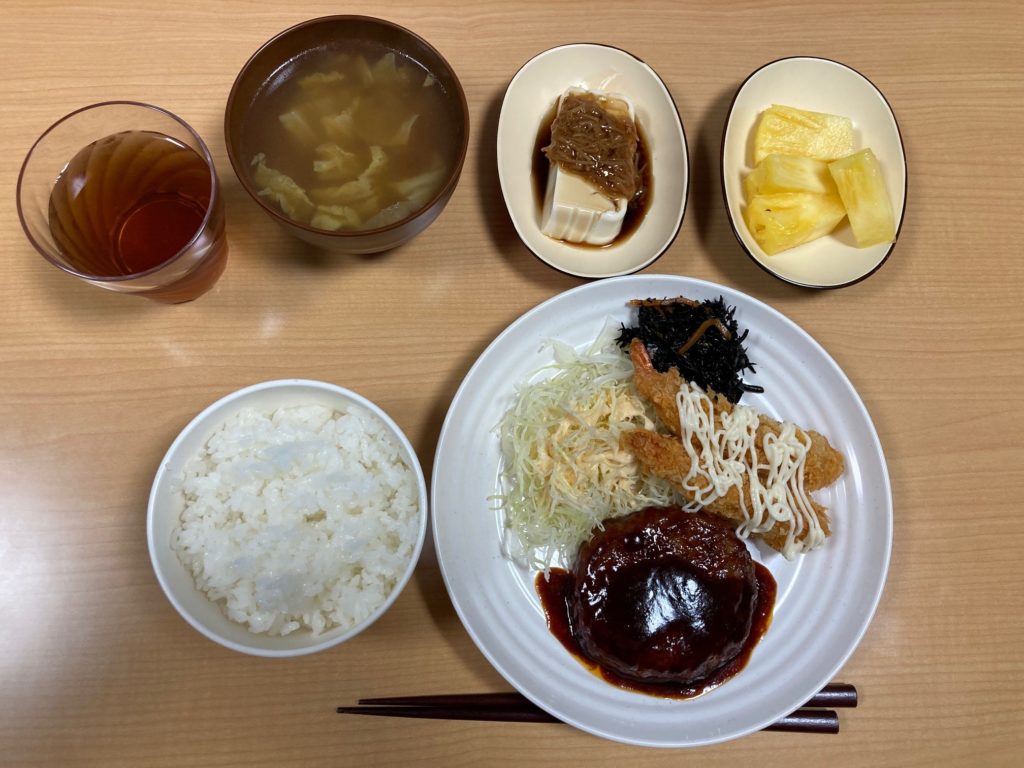 利用者さんも大好きなハンバーグとエビフライ(洋食屋さんの人気メニューですよね❣)