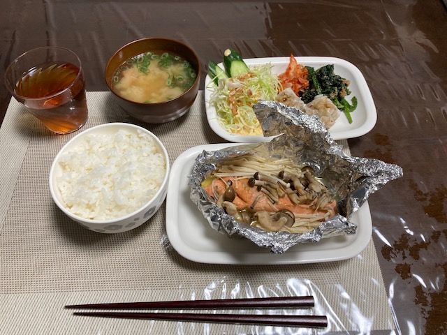 沢山キノコの鮭のホイル焼き(バター醤油味)、シュウマイ、ほうれん草胡麻和え、キムチ、サラダ、豆腐みそ汁