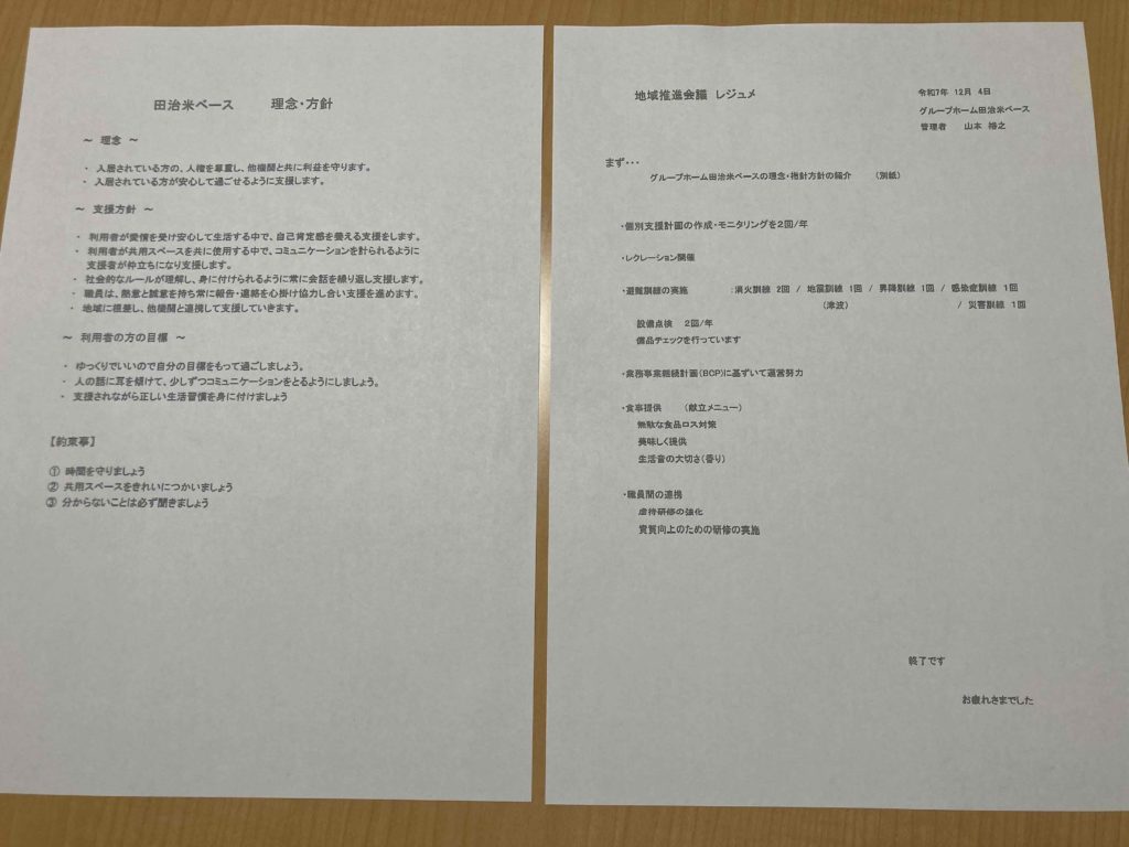 今回の会議では地域連携推進の趣旨を説明させて頂き、同時に法人理念、方針を伝え自立した生活が出来るようグループホームでの支援内容を説明させて頂きました。また色々な意見も出ましたので出来る限り達成できるよう進めてまいります。