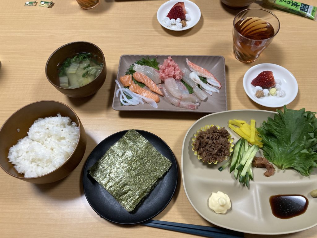 手巻き寿司の具材 サーモン、鯛、カンパチ、イカ、まぐろタタキ、カニカマ、甘辛そぼろ、きゅうり、たくわん、大場、梅肉タタキ、マヨネーズ、手巻き用のり、山芋と白菜のすまし汁、イチゴ、豆