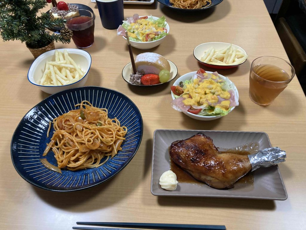 利用者が少しでも楽しい想いが出来るようにと管理者と世話人さんとで何度も会議をしてメニューを考えて手作り料理を振舞いました。リビングもクリスマス飾りで飾り付けて雰囲気ばっちりでしたよ。